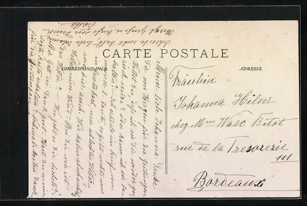 Personenbezogene Daten auf der Rückseite der Karte wurden durch blauen Textmarker unkenntlich gemacht. Die blauen Stellen sind auf die Vorderseite durchgeweicht und wirken sich negativ auf das Postkartenfoto aus
