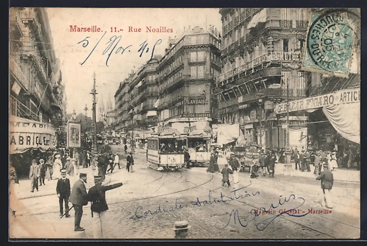 AK Marseille, Rue Noailles, Strassenbahn