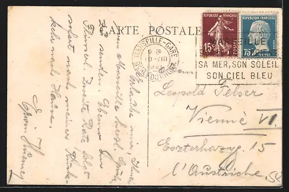 Personenbezogene Daten auf der Rückseite der Karte wurden durch blauen Textmarker unkenntlich gemacht. Die blauen Stellen sind auf die Vorderseite durchgeweicht und wirken sich negativ auf das Postkartenfoto aus