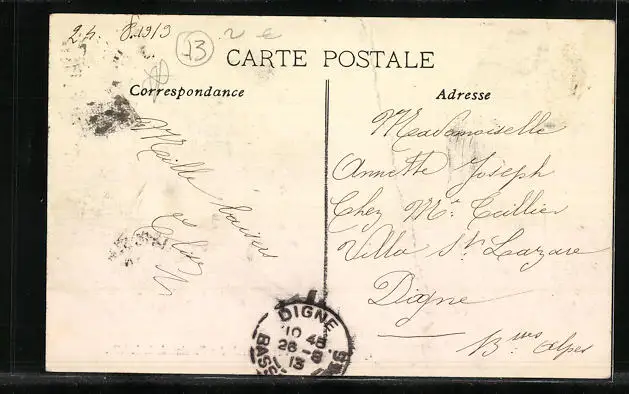 Personenbezogene Daten auf der Rückseite der Karte wurden durch blauen Textmarker unkenntlich gemacht. Die blauen Stellen sind auf die Vorderseite durchgeweicht und wirken sich negativ auf das Postkartenfoto aus