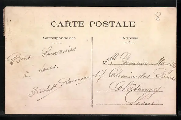 Personenbezogene Daten auf der Rückseite der Karte wurden durch blauen Textmarker unkenntlich gemacht. Die blauen Stellen sind auf die Vorderseite durchgeweicht und wirken sich negativ auf das Postkartenfoto aus