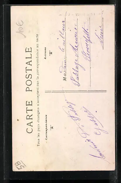 Personenbezogene Daten auf der Rückseite der Karte wurden durch blauen Textmarker unkenntlich gemacht. Die blauen Stellen sind auf die Vorderseite durchgeweicht und wirken sich negativ auf das Postkartenfoto aus