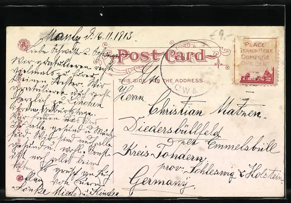 alte Ansichtskarte, gelaufen, Briefmarke entfernt, Bugspuren oben mittig und oben re., guter Zustand