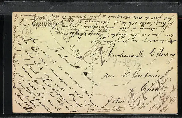 Personenbezogene Daten auf der Rückseite der Karte wurden durch blauen Textmarker unkenntlich gemacht. Die blauen Stellen sind auf die Vorderseite durchgeweicht und wirken sich negativ auf das Postkartenfoto aus