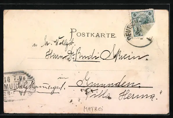 gelaufen 1902, Briefmarke tw. entfernt, Eckknick re. oben, guter Zustand