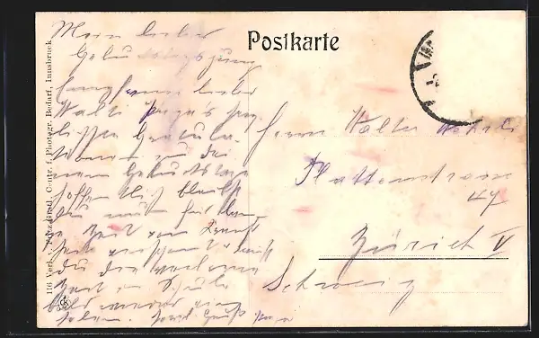 Personenbezogene Daten auf der Rückseite der Karte wurden durch blauen Textmarker unkenntlich gemacht. Die blauen Stellen sind auf die Vorderseite durchgeweicht und wirken sich negativ auf das Postkartenfoto aus