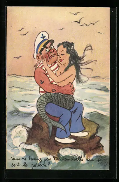 AK Matrose mit Nixe auf einem Felsen