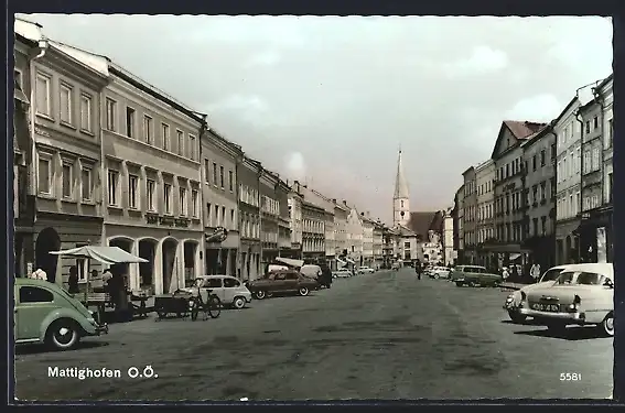 AK Mattighofen /O.-Ö., Strassenpartie mit Autos und Geschäften