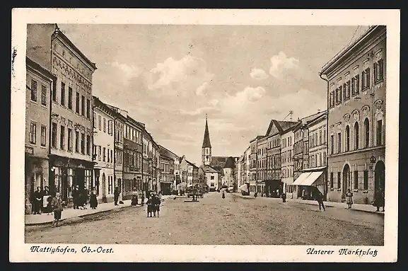 AK Mattighofen /Ob.-Oest., Der Untere Marktplatz mit Blick zur Kirche