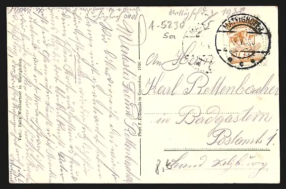 Personenbezogene Daten auf der Rückseite der Karte wurden durch blauen Textmarker unkenntlich gemacht. Die blauen Stellen sind auf die Vorderseite durchgeweicht und wirken sich negativ auf das Postkartenfoto aus