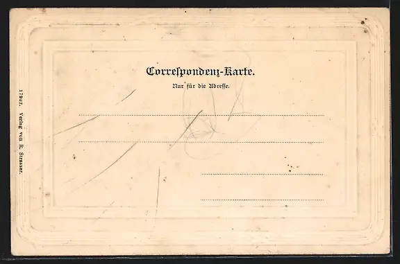 Personenbezogene Daten auf der Rückseite der Karte wurden durch blauen Textmarker unkenntlich gemacht. Die blauen Stellen sind auf die Vorderseite durchgeweicht und wirken sich negativ auf das Postkartenfoto aus