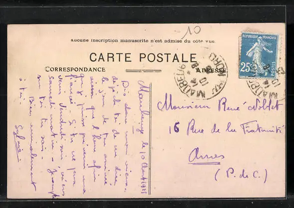 Personenbezogene Daten auf der Rückseite der Karte wurden durch blauen Textmarker unkenntlich gemacht. Die blauen Stellen sind auf die Vorderseite durchgeweicht und wirken sich negativ auf das Postkartenfoto aus