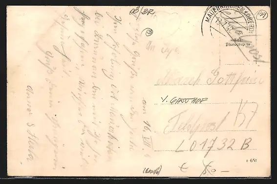 Personenbezogene Daten auf der Rückseite der Karte wurden durch blauen Textmarker unkenntlich gemacht. Die blauen Stellen sind auf die Vorderseite durchgeweicht und wirken sich negativ auf das Postkartenfoto aus