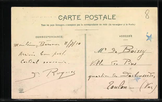 Personenbezogene Daten auf der Rückseite der Karte wurden durch blauen Textmarker unkenntlich gemacht. Die blauen Stellen sind auf die Vorderseite durchgeweicht und wirken sich negativ auf das Postkartenfoto aus