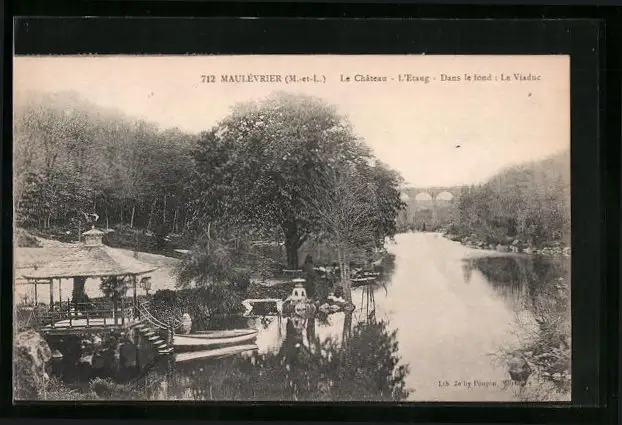 AK Maulévrier, Le Chateau, L'Etang, Dans le fond: Le Viaduc