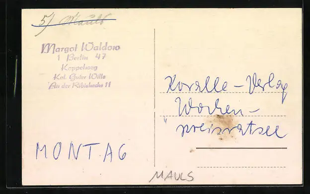 Personenbezogene Daten auf der Rückseite der Karte wurden durch blauen Textmarker unkenntlich gemacht. Die blauen Stellen sind auf die Vorderseite durchgeweicht und wirken sich negativ auf das Postkartenfoto aus