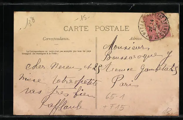Personenbezogene Daten auf der Rückseite der Karte wurden durch blauen Textmarker unkenntlich gemacht. Die blauen Stellen sind auf die Vorderseite durchgeweicht und wirken sich negativ auf das Postkartenfoto aus
