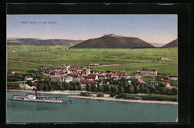 AK Mautern a.d. Donau, Ortsansicht mit Dampfschiff