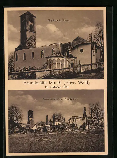 AK Mauth /Bayr. Wald, Brand vom 28.10.1920, Abgebrannte Kirche