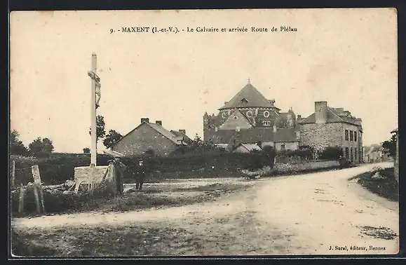 AK Maxent, Le Calvaire et arrivée Route de Plélan