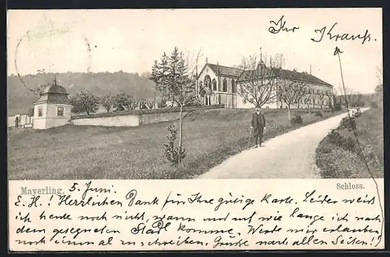 AK Mayerling, Blick zum Schloss, Mann mit Stock