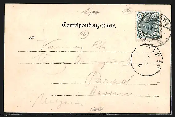 Personenbezogene Daten auf der Rückseite der Karte wurden durch blauen Textmarker unkenntlich gemacht. Die blauen Stellen sind auf die Vorderseite durchgeweicht und wirken sich negativ auf das Postkartenfoto aus