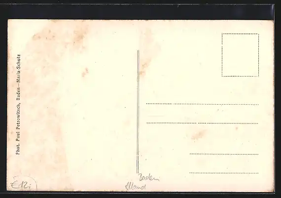 Personenbezogene Daten auf der Rückseite der Karte wurden durch blauen Textmarker unkenntlich gemacht. Die blauen Stellen sind auf die Vorderseite durchgeweicht und wirken sich negativ auf das Postkartenfoto aus