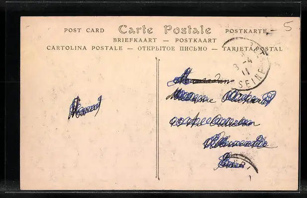 Personenbezogene Daten auf der Rückseite der Karte wurden durch blauen Textmarker unkenntlich gemacht. Die blauen Stellen sind auf die Vorderseite durchgeweicht und wirken sich negativ auf das Postkartenfoto aus
