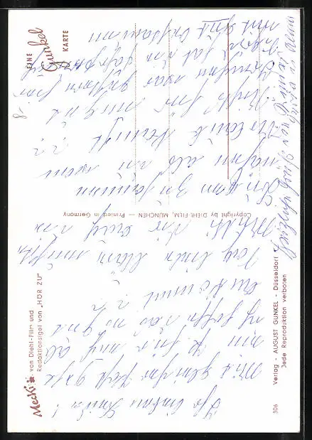 Personenbezogene Daten auf der Rückseite der Karte wurden durch blauen Textmarker unkenntlich gemacht. Die blauen Stellen sind auf die Vorderseite durchgeweicht und wirken sich negativ auf das Postkartenfoto aus