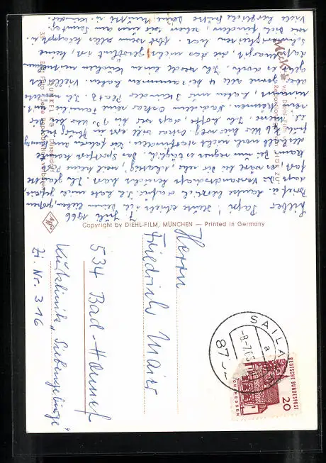Personenbezogene Daten auf der Rückseite der Karte wurden durch blauen Textmarker unkenntlich gemacht. Die blauen Stellen sind auf die Vorderseite durchgeweicht und wirken sich negativ auf das Postkartenfoto aus