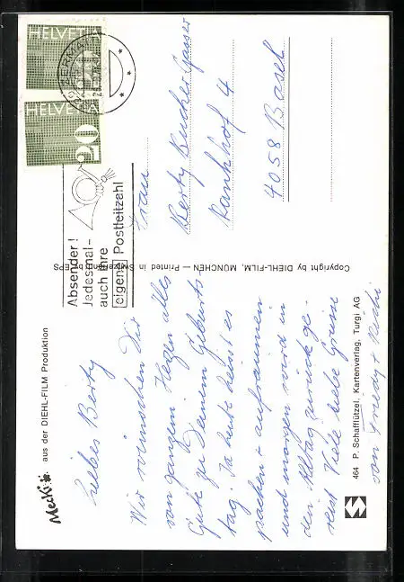 Personenbezogene Daten auf der Rückseite der Karte wurden durch blauen Textmarker unkenntlich gemacht. Die blauen Stellen sind auf die Vorderseite durchgeweicht und wirken sich negativ auf das Postkartenfoto aus
