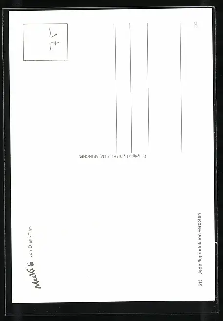 Personenbezogene Daten auf der Rückseite der Karte wurden durch blauen Textmarker unkenntlich gemacht. Die blauen Stellen sind auf die Vorderseite durchgeweicht und wirken sich negativ auf das Postkartenfoto aus