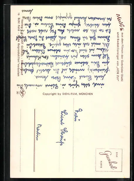 Personenbezogene Daten auf der Rückseite der Karte wurden durch blauen Textmarker unkenntlich gemacht. Die blauen Stellen sind auf die Vorderseite durchgeweicht und wirken sich negativ auf das Postkartenfoto aus