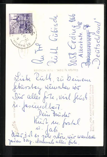 Personenbezogene Daten auf der Rückseite der Karte wurden durch blauen Textmarker unkenntlich gemacht. Die blauen Stellen sind auf die Vorderseite durchgeweicht und wirken sich negativ auf das Postkartenfoto aus
