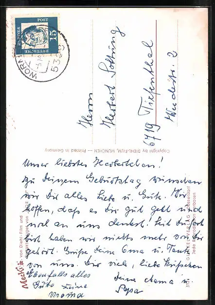Personenbezogene Daten auf der Rückseite der Karte wurden durch blauen Textmarker unkenntlich gemacht. Die blauen Stellen sind auf die Vorderseite durchgeweicht und wirken sich negativ auf das Postkartenfoto aus
