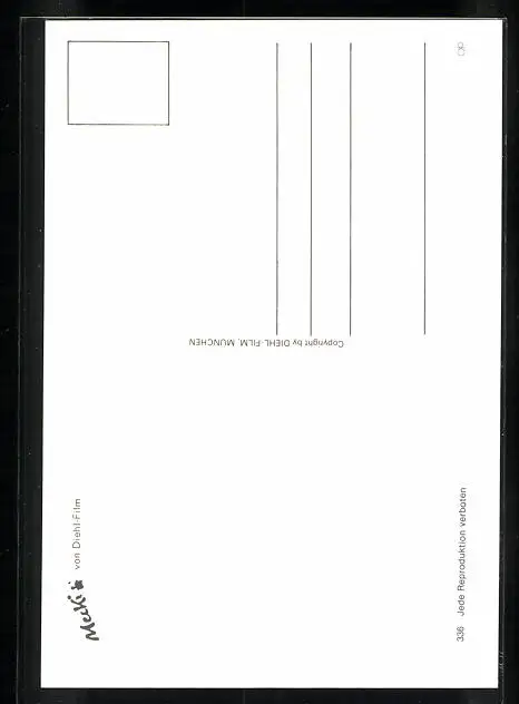 Personenbezogene Daten auf der Rückseite der Karte wurden durch blauen Textmarker unkenntlich gemacht. Die blauen Stellen sind auf die Vorderseite durchgeweicht und wirken sich negativ auf das Postkartenfoto aus