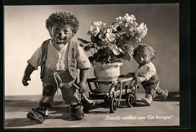 AK Mecki und Sohn mit Blumentopf