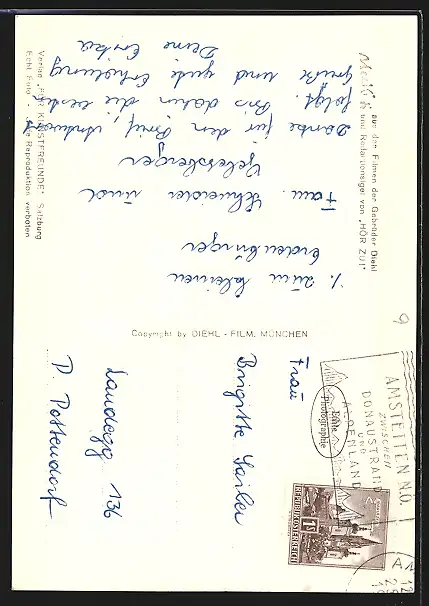 Personenbezogene Daten auf der Rückseite der Karte wurden durch blauen Textmarker unkenntlich gemacht. Die blauen Stellen sind auf die Vorderseite durchgeweicht und wirken sich negativ auf das Postkartenfoto aus