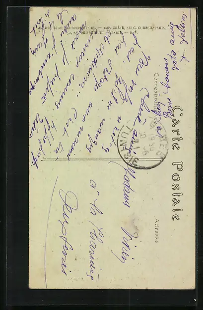 Personenbezogene Daten auf der Rückseite der Karte wurden durch blauen Textmarker unkenntlich gemacht. Die blauen Stellen sind auf die Vorderseite durchgeweicht und wirken sich negativ auf das Postkartenfoto aus