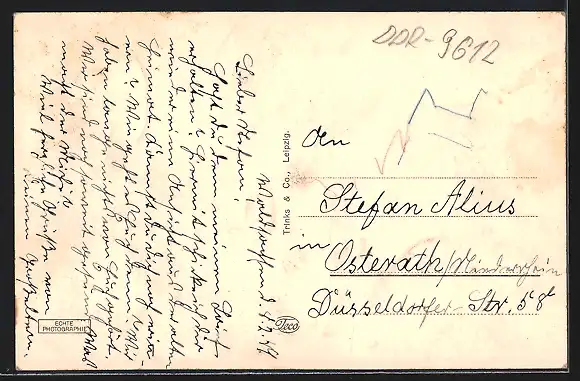 Personenbezogene Daten auf der Rückseite der Karte wurden durch blauen Textmarker unkenntlich gemacht. Die blauen Stellen sind auf die Vorderseite durchgeweicht und wirken sich negativ auf das Postkartenfoto aus