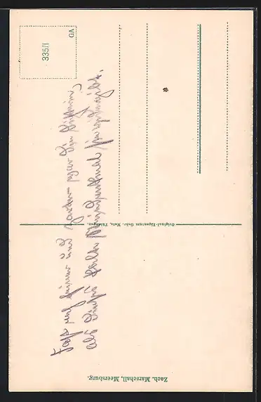 Personenbezogene Daten auf der Rückseite der Karte wurden durch blauen Textmarker unkenntlich gemacht. Die blauen Stellen sind auf die Vorderseite durchgeweicht und wirken sich negativ auf das Postkartenfoto aus