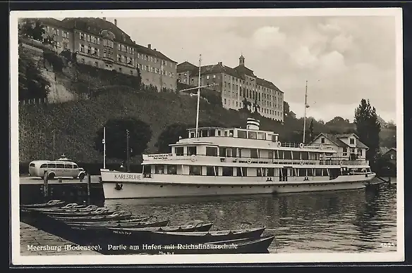 AK Meersburg, Bodensee-Dampfer Karlsruhe im Hafen, Reichsfinanzschule