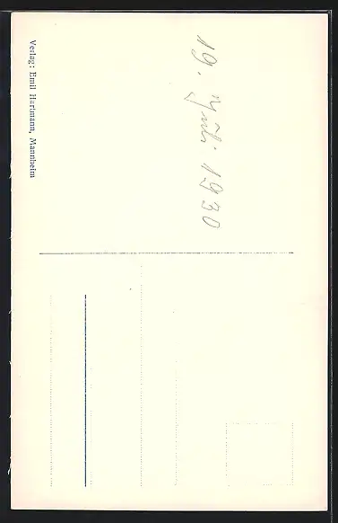 Personenbezogene Daten auf der Rückseite der Karte wurden durch blauen Textmarker unkenntlich gemacht. Die blauen Stellen sind auf die Vorderseite durchgeweicht und wirken sich negativ auf das Postkartenfoto aus