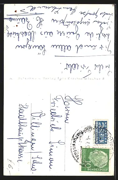 Personenbezogene Daten auf der Rückseite der Karte wurden durch blauen Textmarker unkenntlich gemacht. Die blauen Stellen sind auf die Vorderseite durchgeweicht und wirken sich negativ auf das Postkartenfoto aus