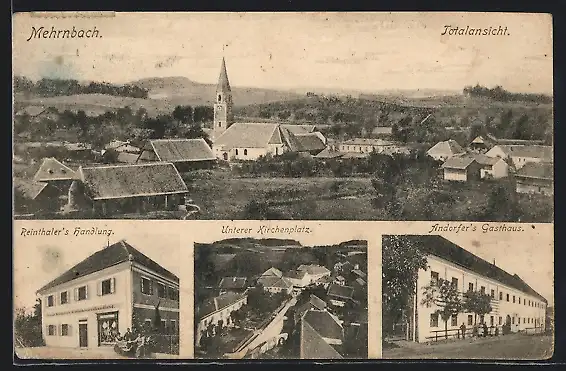 AK Mehrnbach, Reinthaler`s Handlung, Andorfer`s Gasthaus, Unterer Kirchenplatz, Totalansicht