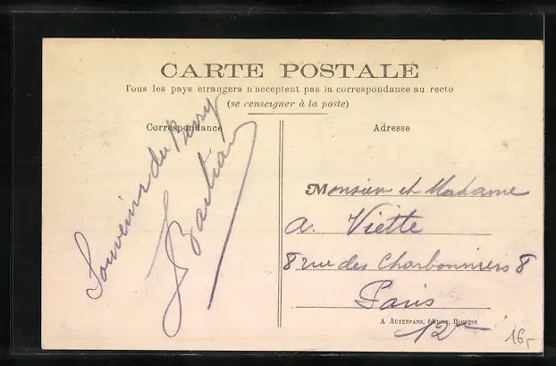 Personenbezogene Daten auf der Rückseite der Karte wurden durch blauen Textmarker unkenntlich gemacht. Die blauen Stellen sind auf die Vorderseite durchgeweicht und wirken sich negativ auf das Postkartenfoto aus