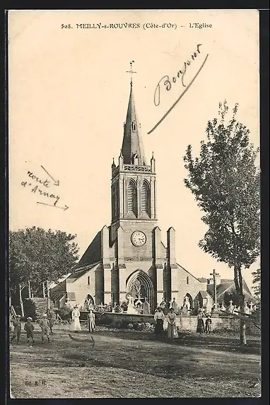 AK Meilly-sur-Rouvres, L`Église avec des gens devant