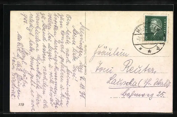 Personenbezogene Daten auf der Rückseite der Karte wurden durch blauen Textmarker unkenntlich gemacht. Die blauen Stellen sind auf die Vorderseite durchgeweicht und wirken sich negativ auf das Postkartenfoto aus