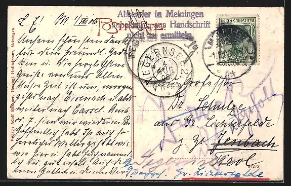 Personenbezogene Daten auf der Rückseite der Karte wurden durch blauen Textmarker unkenntlich gemacht. Die blauen Stellen sind auf die Vorderseite durchgeweicht und wirken sich negativ auf das Postkartenfoto aus