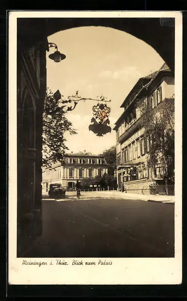 AK Meiningen /Th., Strassenpartie mit Palais